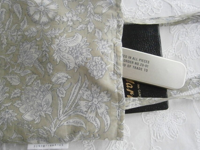 *色 バッグ→クスミのあるグリーンカーキに紺・白の草花