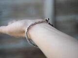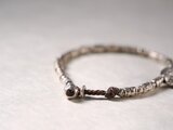 鎚目模様の極太チューブラインに唐草模様の楕円プレートを合わせ、重厚な印象のシルバーブレスレットに仕立てました。