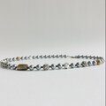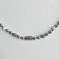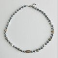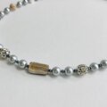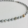 こちらは貝素材の原玉に、オリジナルカラーのパール塗装を何層にも渡り重ね塗りを施した日本製貝パールネックレスになります。パールカラーはきめ細かい質感と程良い艶感で磨き加工を施したグレーパール。ほのかな干渉色が特徴です。パールサイズは直径約7mm玉、花の転写加工をしたガラスビーズ・マーブル模様のシェルビーズ等を組み合わせました。長さは標準的なプリンセスサイズよりもやや長めになる全長約50cmにて仕上げました。テールエンドには2cm程のアジャスターを付けています。