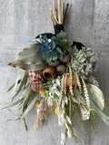 サイズ約40×25㎝動きを持たせたスワッグ。持ち運びもしやすく前撮りなどにも大活躍です。一部ドライフラワーを使用しておりますが長もちするものを選んでおります。長くお楽しみ頂けるプリザーブドフラワーで仕上げました。時間経過によりいずれはゆっくりと退色していきますが、飾る場所によって色もちは異なります。なるべく光や日差しが当たらない涼しい屋内の場所ですと、いい状態を保ちやすいです。お花が過ごしやすい場所に飾ってあげるのもいいのですが、お客様が1番飾りたい場所で飾っていただくのもいいかもしれません。