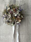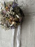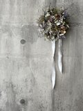 サイズ約15㎝ドライフラワーとプリザーブドフラワー半々くらいの割合のリースです。ドライならではの質感を楽しめる無造作リース。アジサイやスモークツリーのドライにラベンダーやオレガノを合わせました。動きを加えて無造作な形に作りました。時間経過によりいずれはゆっくりと退色していきますが、飾る場所によって色もちは異なります。なるべく光や日差しが当たらない涼しい屋内の場所ですと、いい状態を保ちやすいです。お花が過ごしやすい場所に飾ってあげるのもいいのですが、お客様が1番飾りたい場所で飾っていただくのもいいかもしれません。