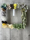 サイズ約30㎝長くお楽しみ頂けるプリザーブドフラワーで仕上げました。13種の植物を合わせた贅沢なリース。スクエアにすることでオリジナル感を出しました。時間経過によりいずれはゆっくりと退色していきますが、飾る場所によって色もちは異なります。なるべく光や日差しが当たらない涼しい屋内の場所ですと、いい状態を保ちやすいです。お花が過ごしやすい場所に飾ってあげるのもいいのですが、お客様が1番飾りたい場所で飾っていただくのもいいかもしれません。