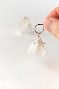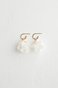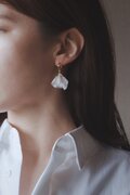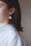 スイートピーをモチーフに、フリルのような透け感が美しい花弁をポリマークレイで表現した耳飾り。立体的な花弁にワイヤーで作ったガクを合わせてちょっとしたアクセントと抜け感を加え、可愛らしさとエレガントさを兼ね備えたデザインに。カジュアルでもオケージョンでも合わせやすく、とても軽いのが魅力です。