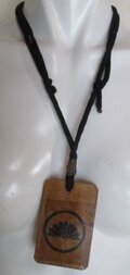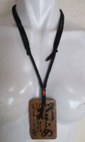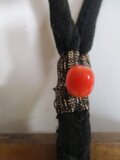 黒の着物で作ったループを付け、ループの先に赤の紅サンゴ、木札、首の所の端に、虎目石を付けています。