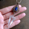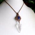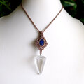透明感があり厚みのあるボリューム感のある円錐形の水晶ペンデュラムと、小粒サイズながらも濃い群青色の中にきらりと輝く金色の(パイライト)が散りばめられてた12月誕生石ラピスラズリを組み合わせたマクラメ編みペンダントネックレスです。