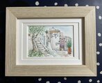 まりんこが滞在先の部屋のテラスから外へ出て、昼下がりの静かな小道の端に座って描いたスケッチを小さな水彩画にしました。まぶしい日差しの下、時間はゆっくり過ぎていきます。