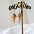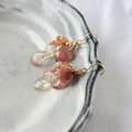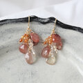 夕陽のような鮮やかな赤が特徴のモンゴル産アンデシン(オレンジラブラドライト)を使ったピアスです。三角形のカットが連なるローズカットと、艷やかな光沢、縁に施された細かなカットが光を反射し、揺れるたびにキラキラと輝きます。
