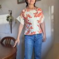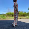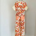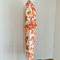 型染めの橙が華やかで夏のイメージになりました。ふわり袖のブラウスとパンツのセットアップスーツです。