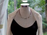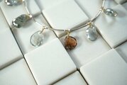 ネックレスの前面半分はこのモスアクアマリンとシルバーチューブ、横から後ろにかけてはルビー(3mmカット型)を使用しています。スモーキーな色合いの石たちが控えめながら美しく散りばめられたネックレスです。