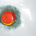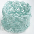 発色の美しい極細サマーヤーンを透かし編みの巾着に仕上げました。