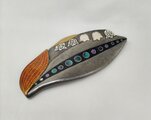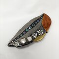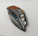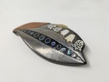 木製粘土で成形して漆で固めたオリジナルの型です。すずらんをモチーフに蒔絵の色々な技法を駆使しました。葉は梨子地(本金)、青金、錫。背景は本銀を黒い漆で固めました。花と葉の線描きは本金を使用しています。茎は錫、花は卵殻と螺鈿、水玉は螺鈿です。見る角度によりさまざまに変化する輝きをお楽しみください。
