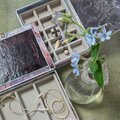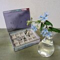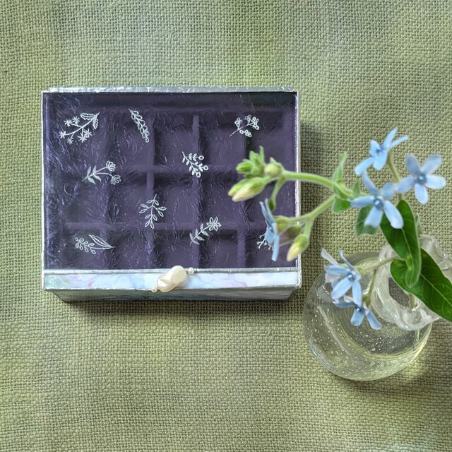 蓋は紫色の結晶ガラスにグラスリッツェンで小花を彫り、シルバーの絵の具を刷り込みました。