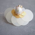 コットンパールとスワロフスキーというクリスタルガラスのクリア、ホワイトオパールを集めて、片側だけホワイトオパールとゴールドのスパンコールを羽のように編み込みました。