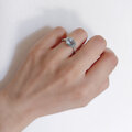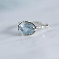 清涼感のある涼しげなアイスブルーの中にほんのりモスグリーンの内包物がまるで雨が降り注いだように入り込んだ表情豊かなモスアクアマリン のリング。