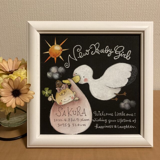 出産祝い、お誕生記念に!/名入れ/ベビーボード/命名ボード/色、文字表記選べます*女の子【チョークアート 原画・額付き】