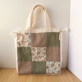 ブラウン系の布でパッチワークした、帆布の巾着バッグです。