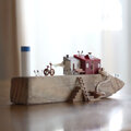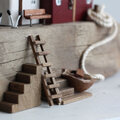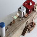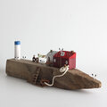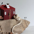 流木、ねじ・釘(赤錆加工)、ホワイトウッド(欧州スプルース、ドイツトウヒなど)、ステイン、ペンキ等で製作。ヤスリでダメージ感を演出しています。「潮騒とカモメの鳴き声、風の音」を感じていただければ幸いです。