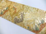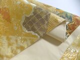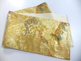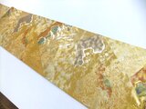 西陣織を示すタグシール跡は制作の際、カットしましたので商品には含まれません。金糸地に鶴の飛群、枝葉の文様で上品な色合いで高級感がございます。