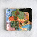 赤土に白化粧泥を塗った後、線彫りしたり彩色により、海辺の田畑や森、大きな鳥のいる田園に建つ一軒家を描いた絵柄の四角皿になります。