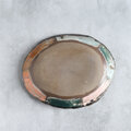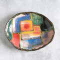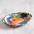 赤土に様々な色化粧泥を塗り、さらに色絵具により抽象画のような絵柄を描いたオーバル形の変形bowlです。