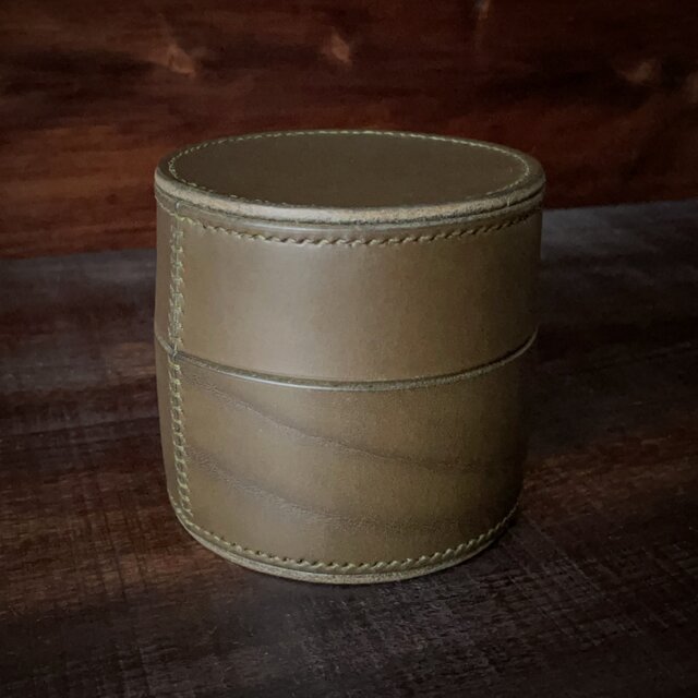 《円柱型》レザー収納ボックス(オリーブ)