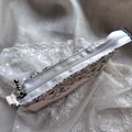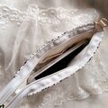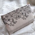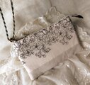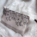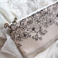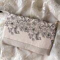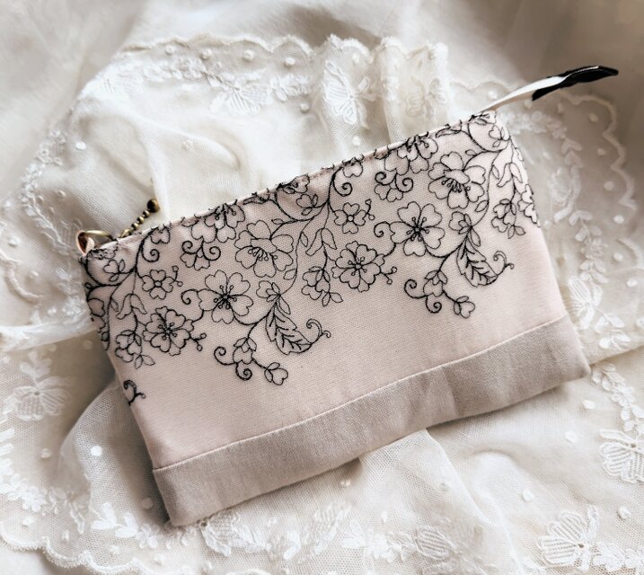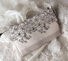 黒糸で優雅な花刺繍が施されたチュールレースとグレージュリネンを合わせたスマホポーチです。