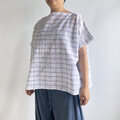 反物を横に使った幅広の身幅に小さな袖をつけたプルオーバーです。フラットな襟ぐりは千鳥がけで仕上げています。