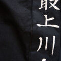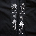 襟部分にはオリジナルの半纏襟に別布が縫い付けられ、そこに手書きで「最上川舟唄」と記されています。