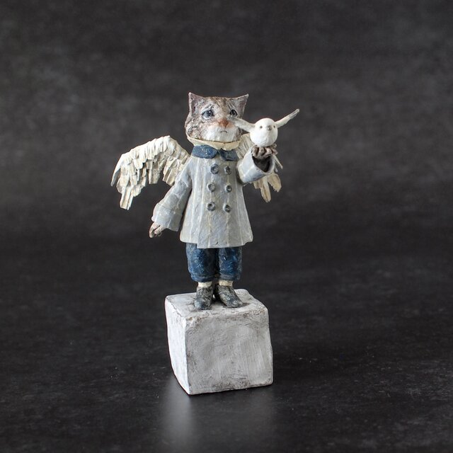 羽をたたえた猫の少年が、胸に抱く一羽の白い小鳥。
