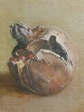 ある日、モチーフ用の柘榴がテーブルからに落ちて、数個の実が床に散らばった。その瞬間とても神聖なものに触れたような気がして見入ってしまった。散らばった実の赤が少しだけ光っていてとても美しく思えました。