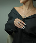 素材は925スターリングシルバーで、変色防止加工が施されています。セッティングされた2mmのモアッサナイトはダイヤモンドに匹敵する輝きを放ち、デザインに高級感を添えます。