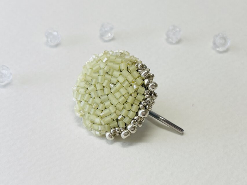 ガラスビーズを、バランスを見ながらひと針ひと針丁寧に縫い付けて制作しています。