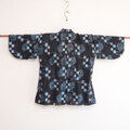 この野良着は、昭和中期に仕立てられたもので、伝統的な絣(かすり)模様の木綿が使用されています。