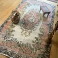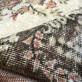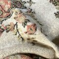 やわらかなベージュトーンに、くすみ感のあるサーモンピンクやグリーン、ブラウンがふんわりと重なるこのラグ。真ん中に咲くように配置されたメダリオンが目を引き、ぐるりと囲むフローラルな模様がまるで絵画のような存在感を放っています。