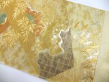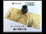 西陣織を示すタグシール跡は制作の際、カットしましたので商品には含まれません。金糸地に鶴の飛群、枝葉の文様で上品な色合いで高級感がございます。両端の無地柄部分は片方は続き部分でもう片方は繋いで製作しました。