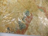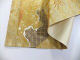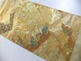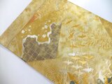 西陣織を示すタグシール跡は制作の際、カットしましたので商品には含まれません。金糸地に鶴の飛群、枝葉の文様で上品な色合いで高級感がございます。両端の無地柄部分は続き部分をそのまま使用しました。