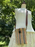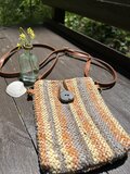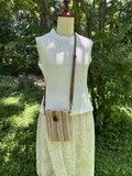 草木染めした布やインド更紗をテープ状に切り裂き、手織りした織地をさらに、手縫いでポシェットに仕立てました。