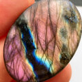 石自体は黒やグレーなど地味な色あいをしていますが、光の加減や見る角度によって鮮やかな輝き(=ラブラドレッセンス)が浮かび上がるところから「アゲハ蝶の羽」に例えられる事もある美しい石です。