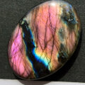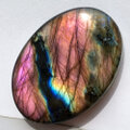 ピンク色ベースでありながら、個性的で存在感のある色彩の、ラブラドライトの楕円形ルースです。