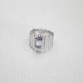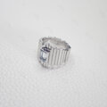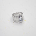 素材は925スターリングシルバーで、変色防止のロジウム加工が施されています。中央には**ナチュラルな長方形ブルートパーズ(5×7mm)**をセッティングしており、澄んだブルーの輝きが清涼感と知性を感じさせます。