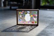 結婚式、前撮り、フォトウェディング、プロポーズ等で使用した後の生花ブーケをお預かりし、オリジナルプレスをして額装いたします。独自の技術で結婚式当日のような生花の美しさを再現し、インテリアとしても褒められるデザイン性の高さが人気です。