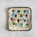 茶褐色の粘土に白化粧泥を刷毛ムラが出るように手塗りし、その上から藍色、黄緑、赤、黄色の絵具を使い抽象画のような絵模様を描いております。