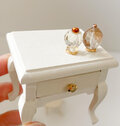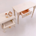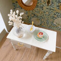 𓊆 テーブル𓊇木材で製作しております。マットなアクリル塗装で仕上げています。引き出しは開きます。シナモンロールは粘土で、お皿もレジンで制作しています。
