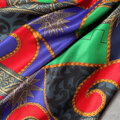華やかな色彩と曲線が交錯するエキゾチックなデザインが魅力的なスクエアスカーフ。