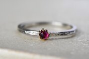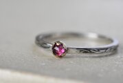 リング部分には風になびく草木をイメージした彫りをいれて、気品のあるワインレッドの光を放つローズカットのロードライトガーネットを10金で包んでみました。