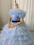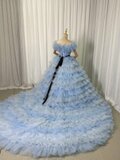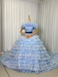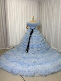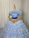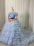 美品!カラードレス ブルー オフショルダー キラキラチュール 柔らかく重ねたチュールスカート 可愛い 前撮り