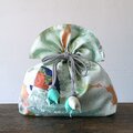 「FUGURO」は、その昔ながらの風習を再現し、リメイクしたものです。素材となるのは、箪笥に眠る何千枚もの中から選りすぐった、おめでたい文様の着物地。手にする人の幸せを願う気持ちをしっかりと縫い込めながら、一つひとつ丁寧な手仕事で仕上げています。