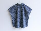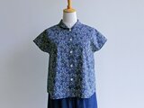 紺地に描かれたカラフルな小花柄がキュートな国産のコットン100%のリップル生地を使った、フレンチスリーブのブラウスです。