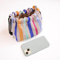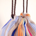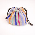 リネンの生成り糸と絹の染め糸を使い布を織り、爽やかストライプ柄の巾着バッグを作りました!