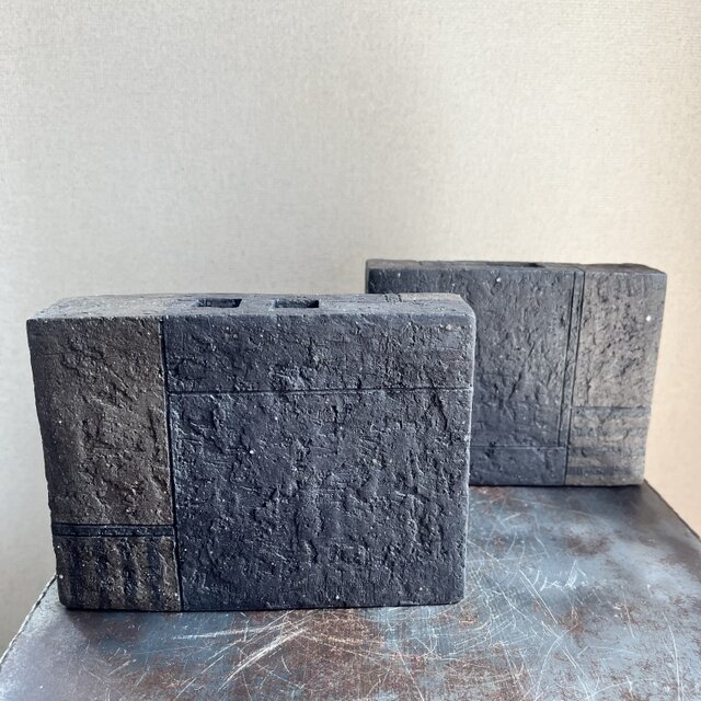 掛花入れ 黒釉&焼締 幾何学&縞紋 No.1、2